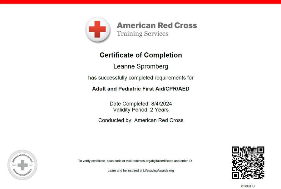 Certified in pediatric CPR/ AED, and First Aide – completed in person